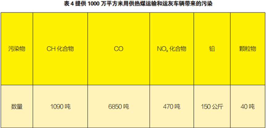 在以上分析中,我們僅涉及了供熱的直接能源消耗,在實(shí)際運(yùn)用過(guò)程中,煤炭還需要有運(yùn)輸?shù)倪^(guò)程,城市燃煤鍋爐還有運(yùn)煤灰的工作,這些是污染的另一個(gè)來(lái)源。有關(guān)部門(mén)計(jì)算了1000萬(wàn)平方米供熱用煤運(yùn)輸帶來(lái)的間接污染。見(jiàn)表4(未計(jì)噪聲污染及運(yùn)輸車(chē)輛增加帶來(lái)的城市交通的惡化)。